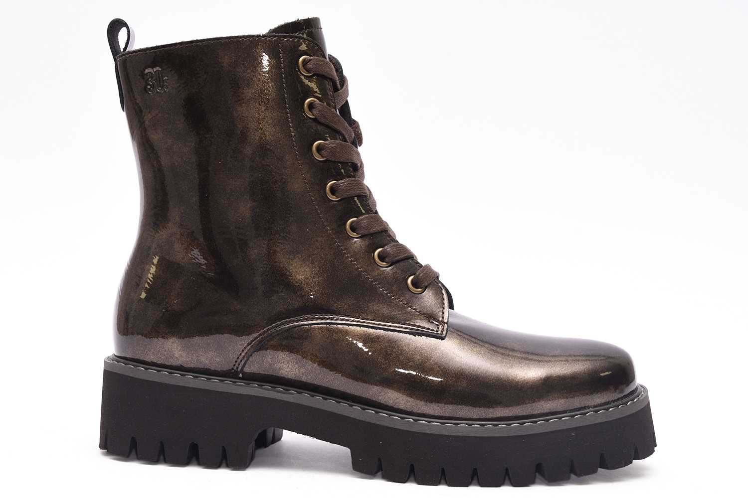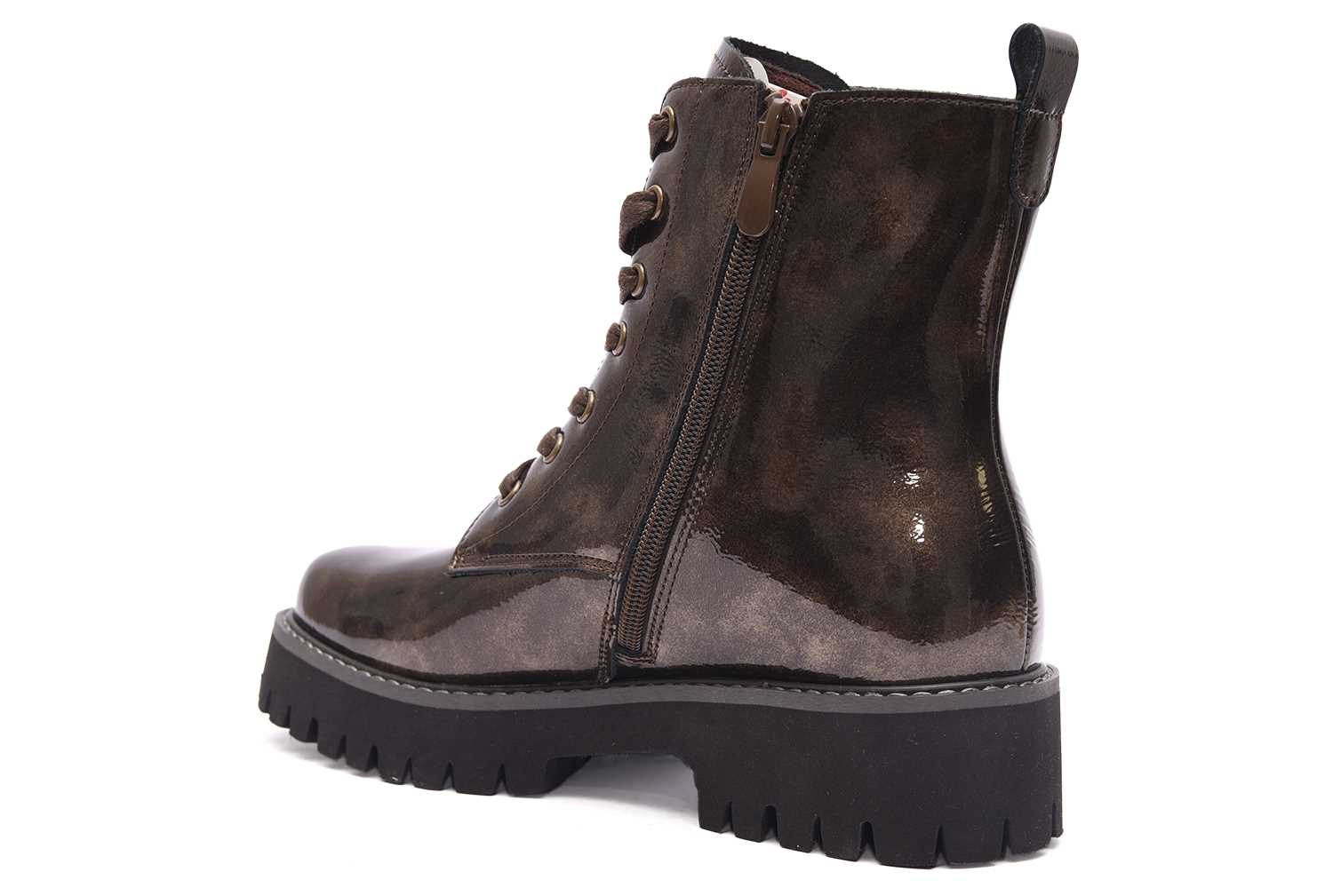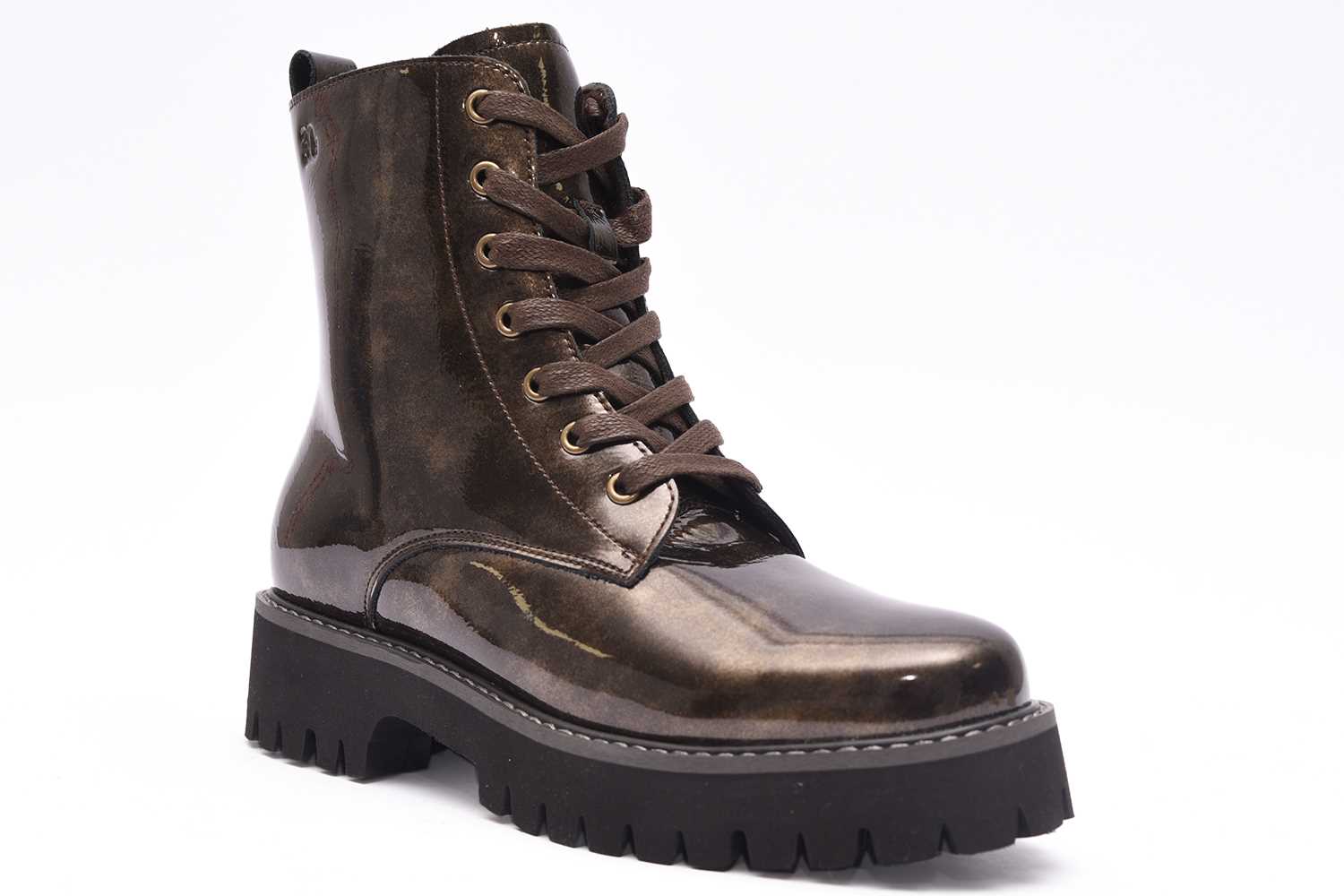 Este botín es sinónimo de calidad premium. Está fabricado íntegramente en España, garantizando la durabilidad y la excelencia de la artesanía nacional. Su composición es exquisita: combina la robustez de la piel en el interior y base con un deslumbrante acabado de charol glossy en el exterior. El color, un profundo tono bronce o marrón oscuro con efecto metalizado, crea un juego de luces único que no pasará desapercibido.