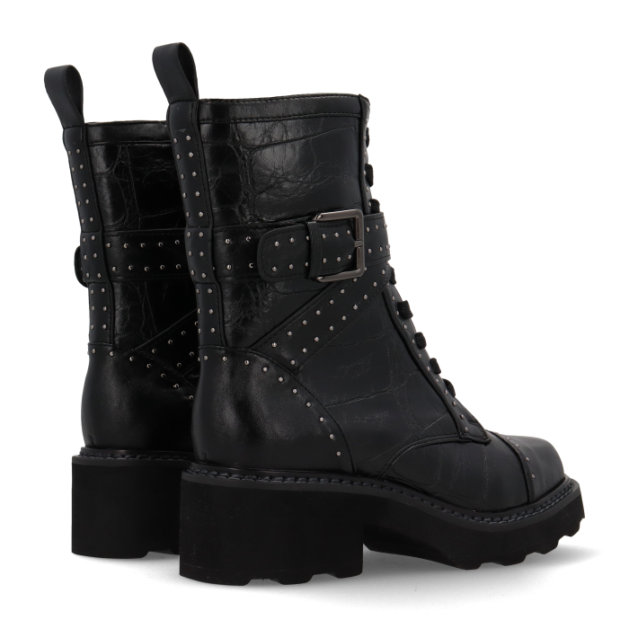 Este modelo eleva el clásico estilo militar a una nueva categoría de lujo rebelde. Su piel negra de acabado con textura está exquisitamente salpicada de micro-tachuelas metálicas, creando un brillo sutil pero impactante. El protagonismo se lo lleva la robusta hebilla ajustable en el tobillo, un detalle biker esencial que refuerza su carácter.