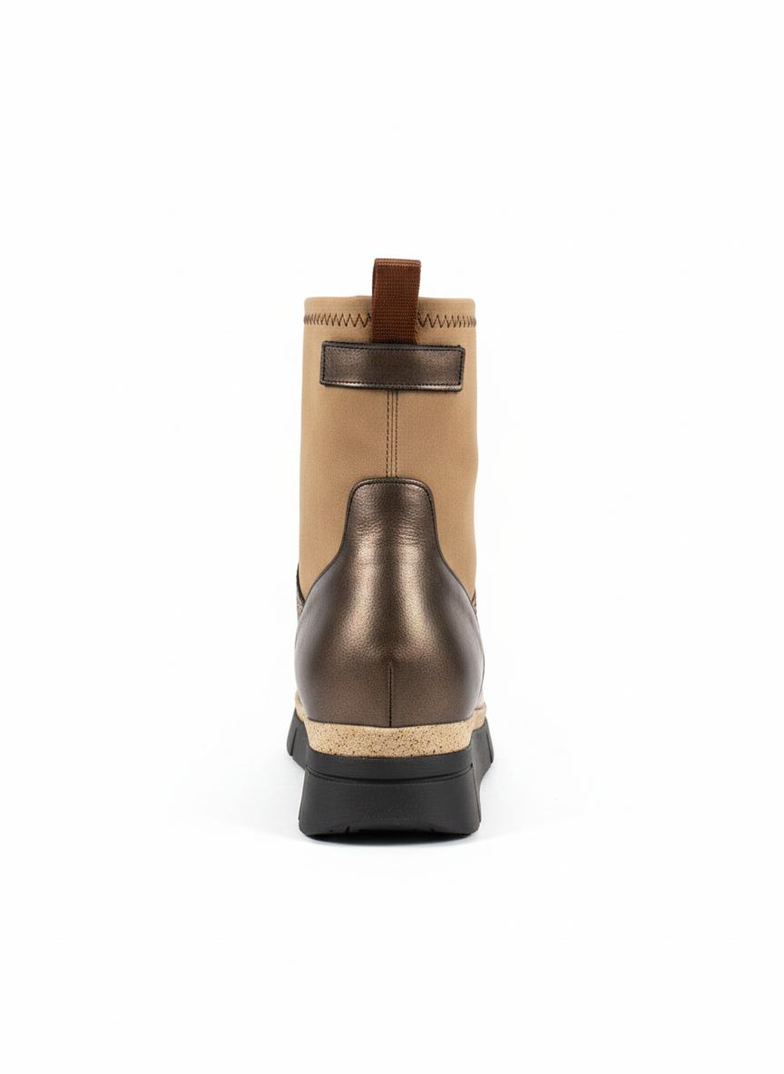 Diseño Exclusivo y Multifacético: La bota presenta una armoniosa combinación de tonos tierra, que van desde un beige arena en la parte superior, pasando por un marrón coñac en la puntera y la base, hasta un elegante acabado metalizado oscuro en el talón. Esta paleta de colores facilita su integración con una amplia variedad de atuendos.
