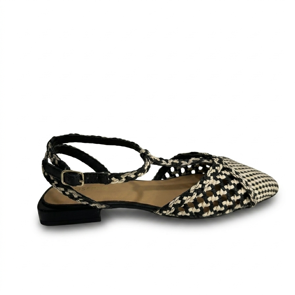 Diseño y Estilo Estas sandalias presentan un exquisito diseño trenzado en un contraste bicolor de blanco y negro, creando un patrón visualmente atractivo y atemporal. Su estructura, con puntera cerrada y diseño de tiras en forma de T, aporta un toque de refinamiento que se aleja de la sandalia plana convencional, convirtiéndolas en una pieza clave para cualquier armario.